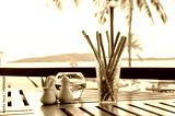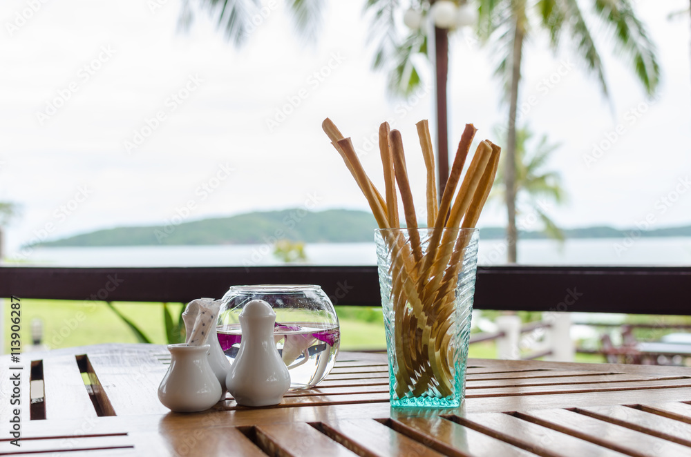 Bread sticks on wood table with background of sea, selective focus