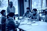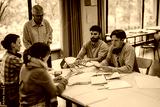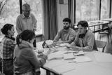 A group of university students working together on a project, guided by a senior professor. The scene captures teamwork, collaboration, and academic development.