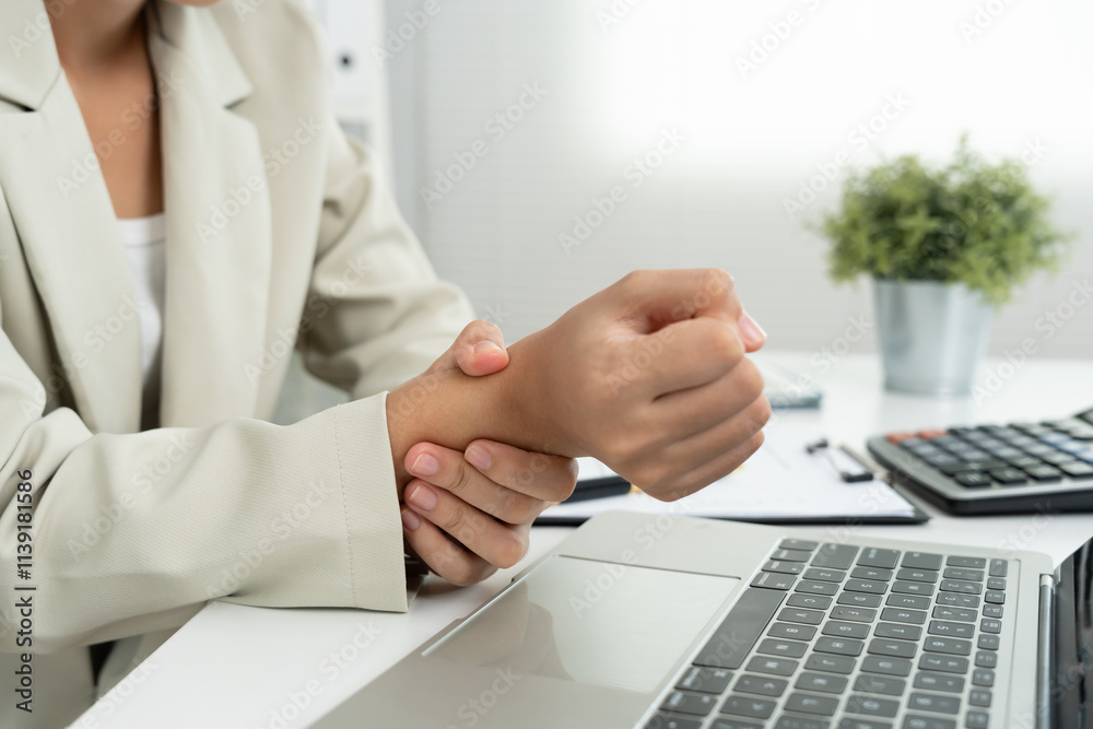 business young woman working in office with a carpal tunnel syndrome or wrist joint inflammation, hand muscle inflammation from office syndrome , hand muscle pain from working