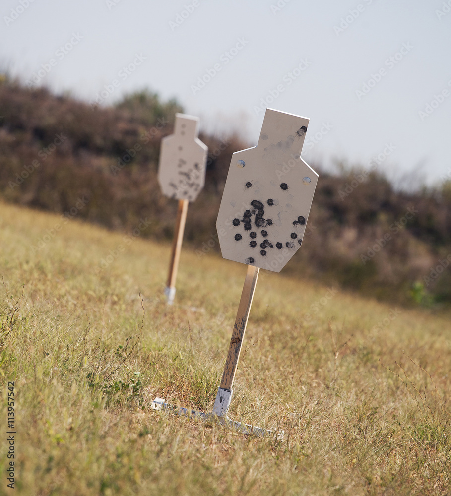 Dual targets that are made from steel for shooting practice with lots of hit marks