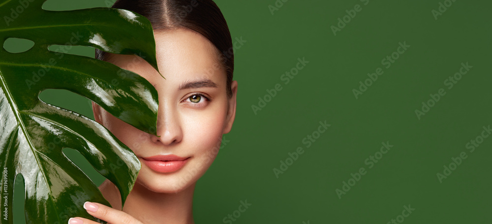 Close up woman face with green exotic leaf. Skin care beauty treatments concept. Model with clean, health skin of face. Monstera Leaves