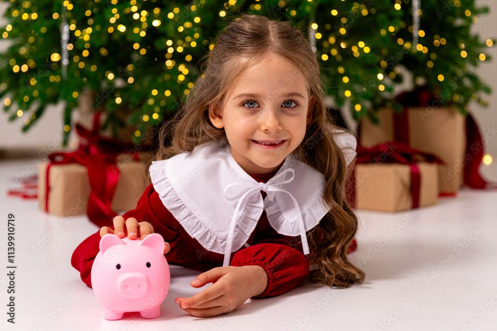 banking, financial, investment and happy people concept - beautiful girl puts coins into pink piggy bank on Christmas. pocket money, family budget and savings concept.