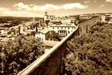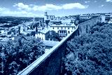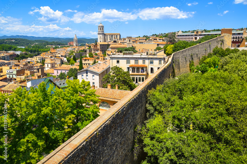 Panoramic aerial view of Girona, defensive walls and cathedral, Catalonia, Spain.