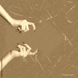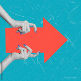 Modern art collage of a hand pointing with a red arrow on a blue background.
