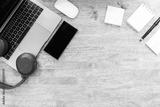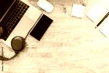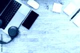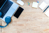 Top view copy space, desk office with laptop, blank notepad, coffee cup and pen on table, Work from home.