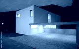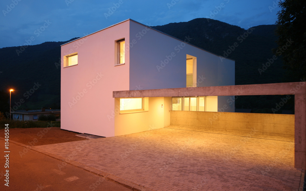 Modern white house exterior, it is night or late evening. Nobody around. New and modern architecture, home for a single family.