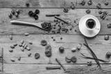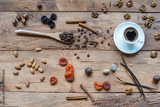 Coffee cup and varieties of nuts and other seeds.