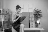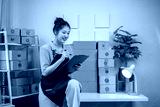 A woman is sitting at a desk with a clipboard and a pen