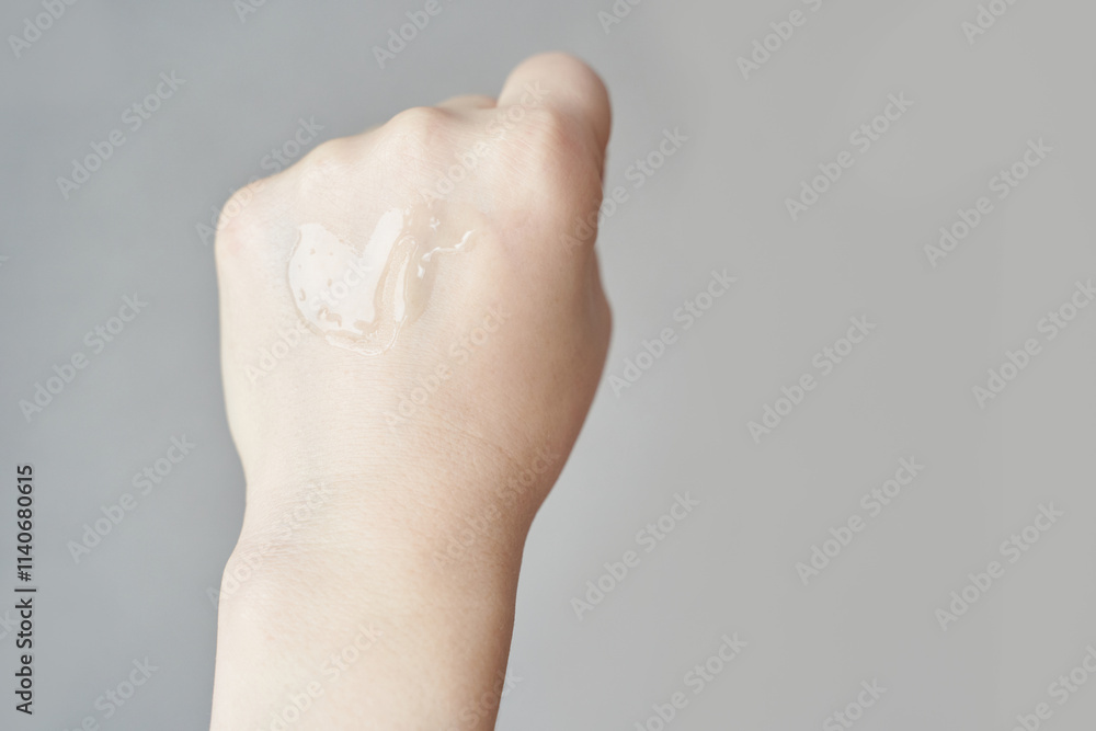 Close up of clear serum on female caucasian hand with light background.