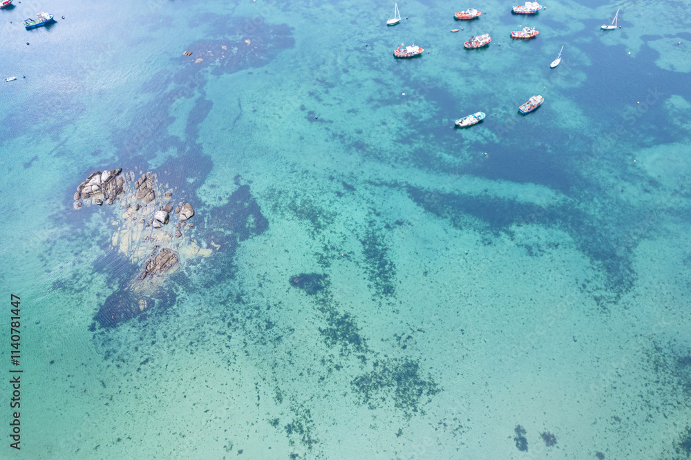 aerial view with drone of fishing boats on the coast of the ria de arousa, province of Pontevedra. Galicia. Spain