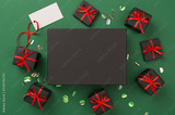 Mock up space with black gift boxes on color background, top view.Black Friday concept