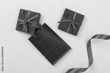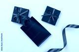 Black shopping bag and gift boxes on color background, top view.Black Friday concept