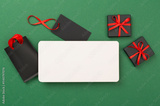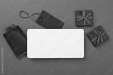 Mock up space with black gift boxes on color background, top view.Black Friday concept