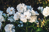 White blooming roses with green leaves on dark blurred background. Floral wallpaper, nice screensaver.