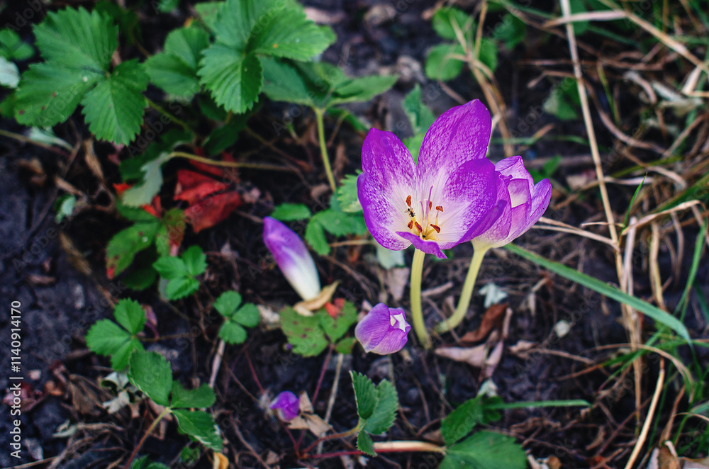 Purple crocus flower, with delicate petals, in blurred green meadow. Buds of unopened flowers.