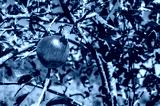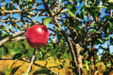 Macro photo of red apple hanging on tree against blue sky background. Apple orchard in autumn.