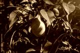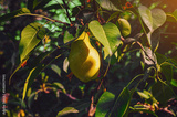 Yellow pear with shiny side on a branch. Blurred background. Artistic composition with ripe fruits.