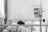Asian boy sleeping on sickbed with infusion pump intravenous IV drip.