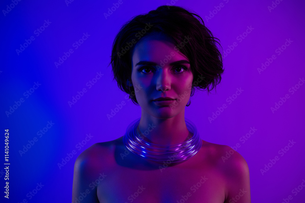 Photo of attractive girl look with plastic wire cable on neck isolated gradient vivid color background