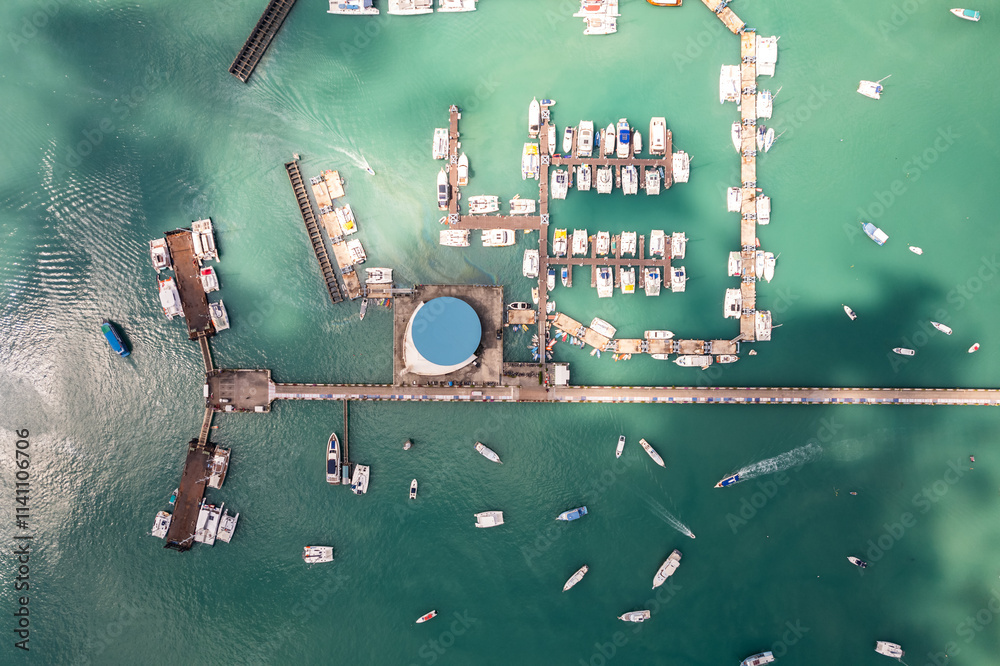 Chalong pier with sailboats and other boats at the sea Top view frome drone camera,Phuket Thailand