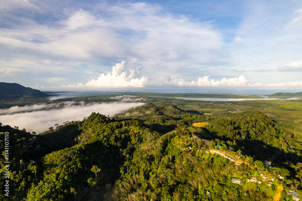 Aerial view drone shot of mountain tropical rainforest,Bird eye view image over the clouds Amazing nature background with clouds and mountain peaks