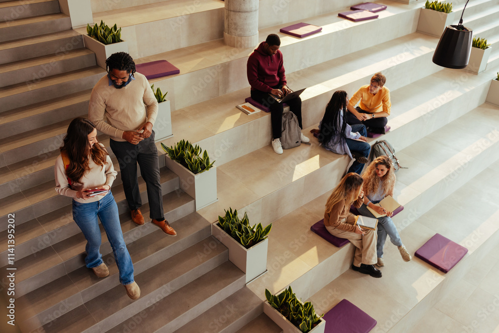 University students walking and studying in modern bleachers