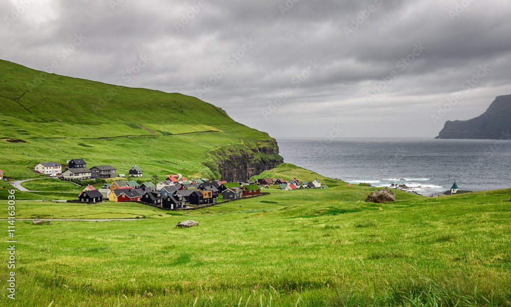 Small village church with cemetery in Gjogv, Faroe Islands, Denmark