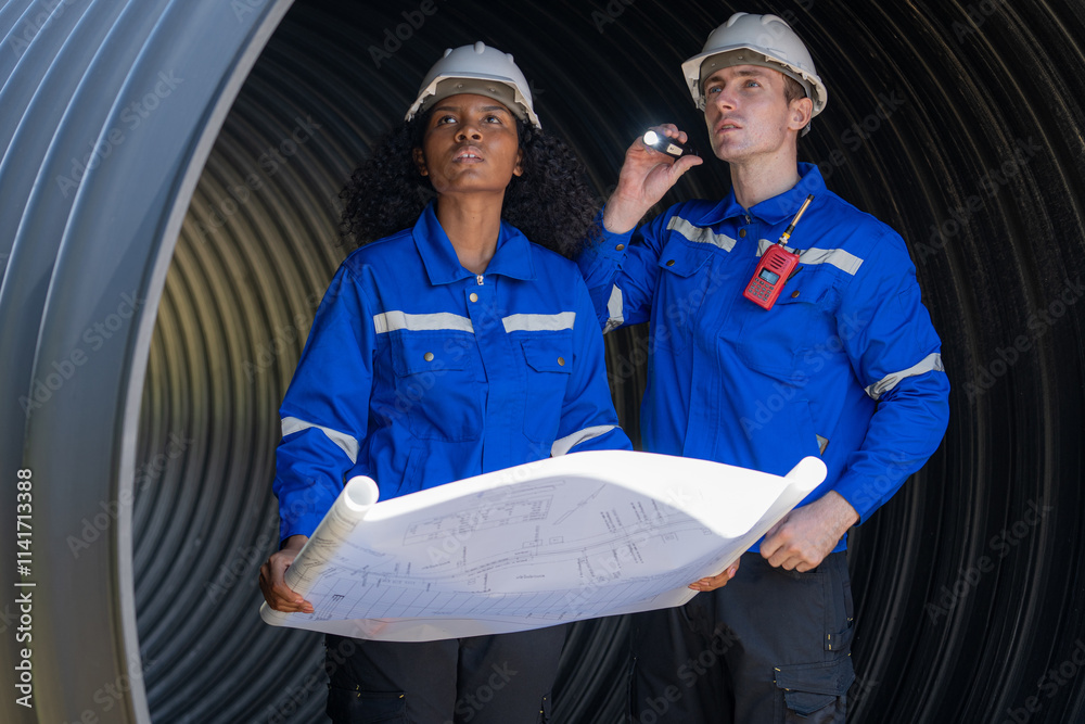 Two Heavy Industry Engineers Walking Inside Pipe Checking Welding. Construction of the Oil, Natural Gas and fuels Transport Pipeline. Industrial Manufacturing Factory.