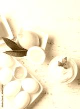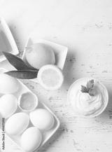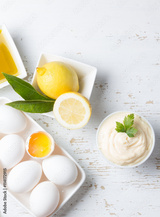 Fresh homemade Mayonnaise and ingredients on white background
