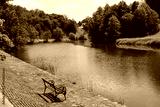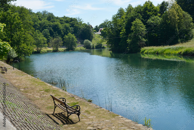 North stone shore of the Dobra River with benches near the village of Jarce Polje in Croatia