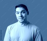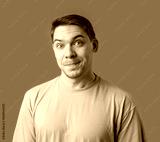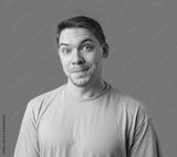 Smiling man in a beige shirt poses against a bright green background