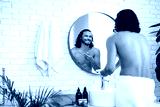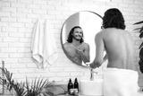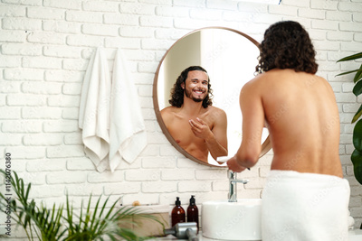 A young man applies skincare cream while looking in a round mirror in a bright bathroom
