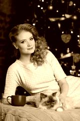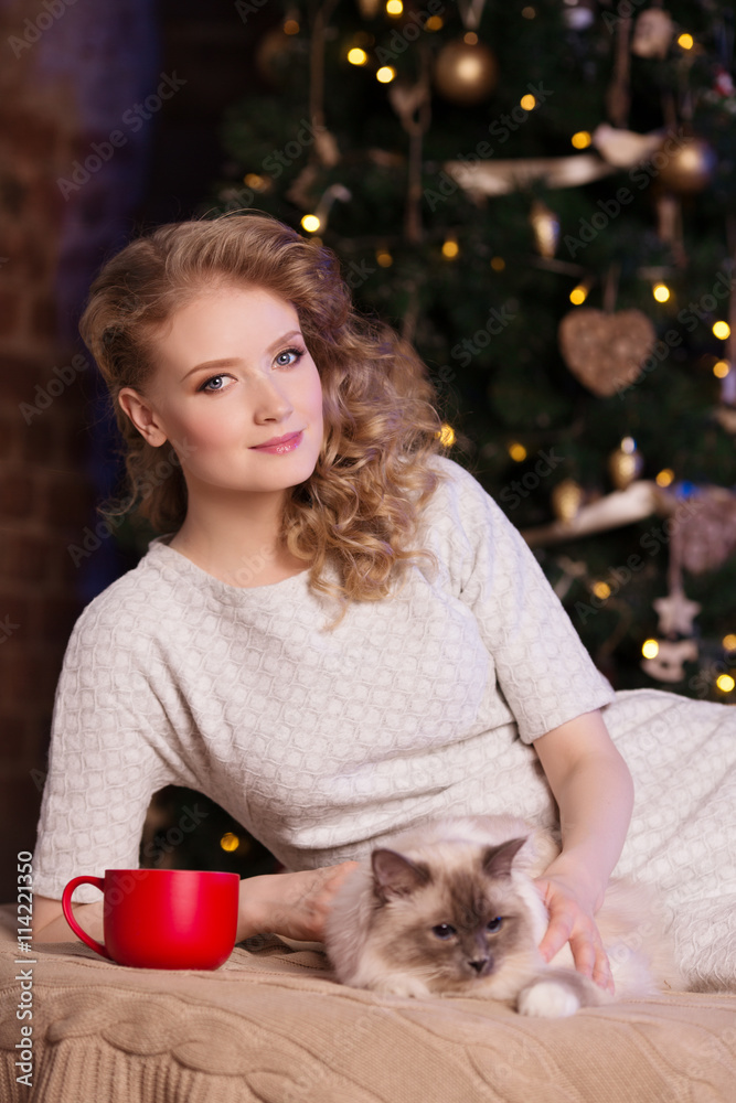 Christmas party, winter holidays woman with cat. New year girl.