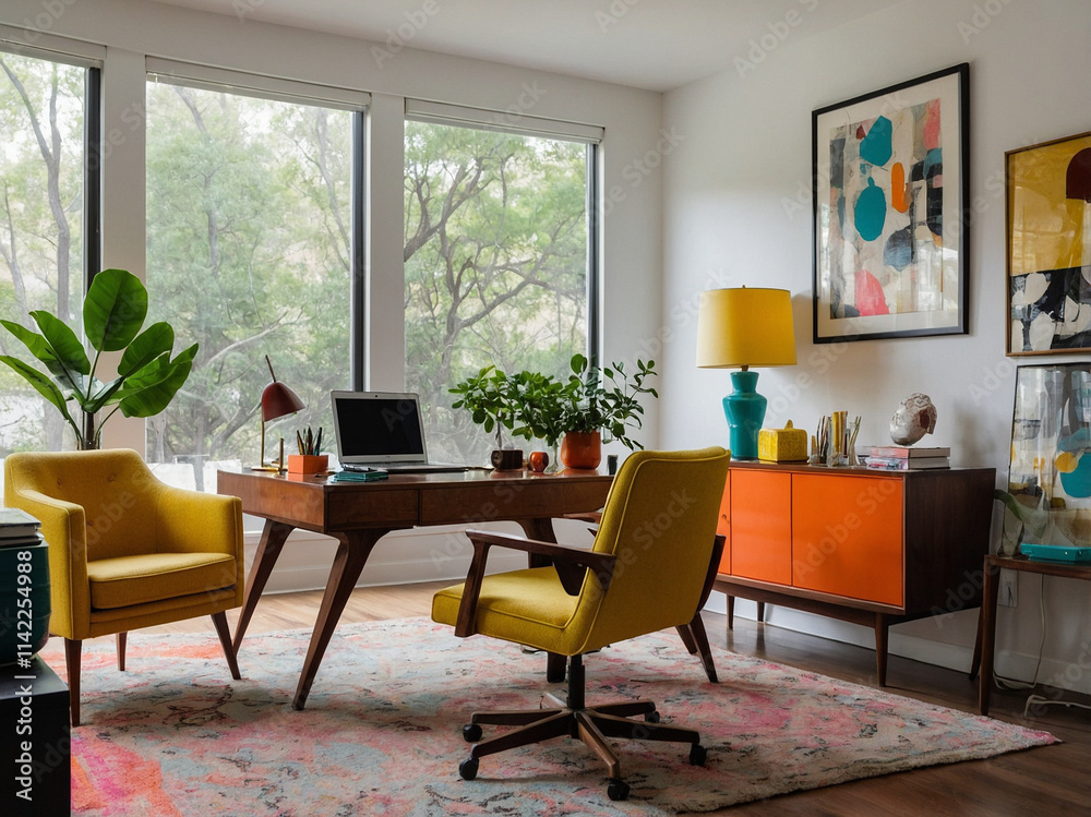 Mid-century home office featuring warm yellow accents, sleek furnishings, and natural light for a bright, inviting workspace ideal for productivity and creativity.