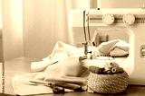 Sewing machine in use on a wooden table, stitching a light fabric in a well-lit indoor workspace