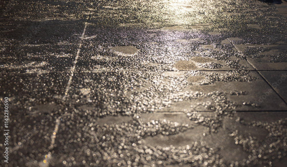 A close-up of icy, wet pavement glistening under sunlight, highlighting its slippery and hazardous surface during cold winter conditions.