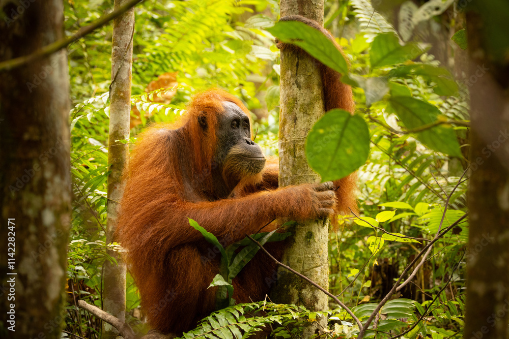 Sumatran orangutan big male in its whole beauty. Amazing sumatran jungle. Beautiful sumatran wildlife. Adventure paradise. Rare and endangered species. Pongo abelii.