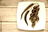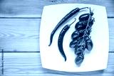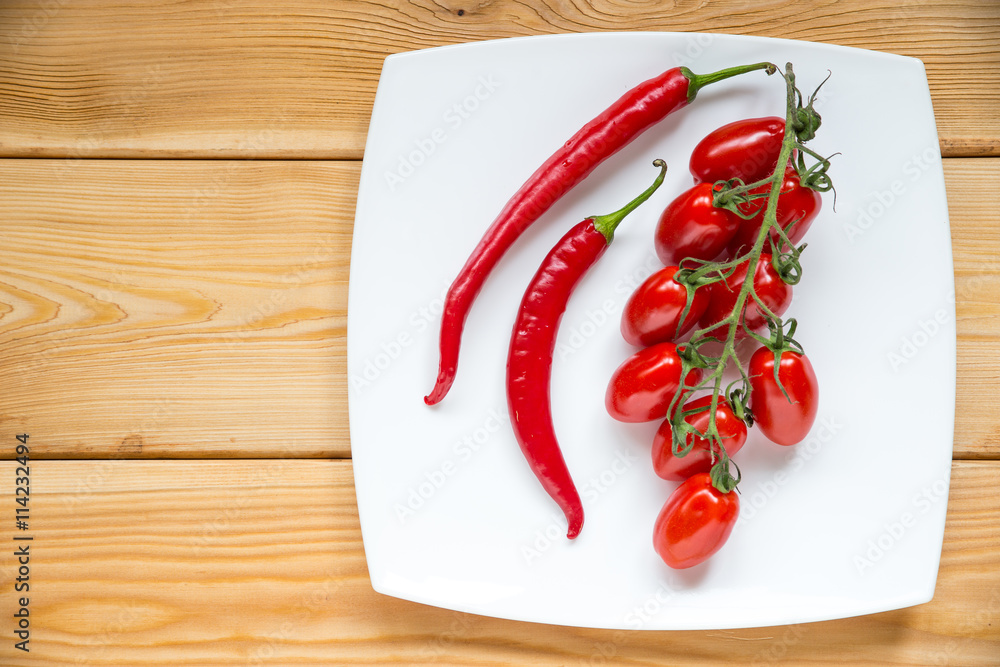 Top view tomatos, chilly pepper on wood background with copyspa