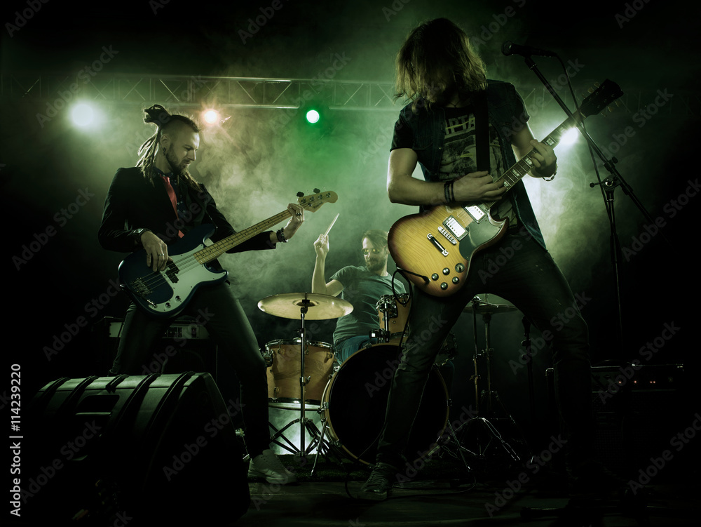 Rock band performs on stage. Guitarist, bass guitar and drums. The guitarist plays solo.