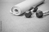 Close up dumbbell, Mat yoga for fitness classes and dumbbells.