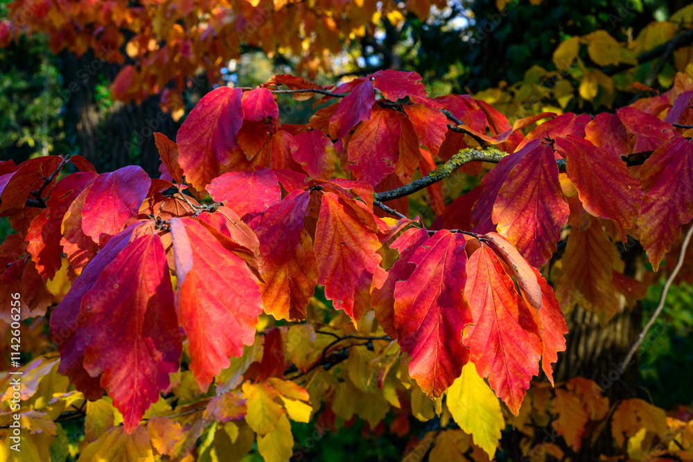 Parrotia persica - a branch of a tree in autumn with beautiful red-yellow leaves on a background of a blue sky