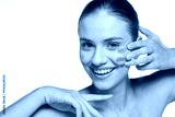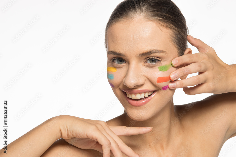 Beautiful young smiling woman posing with different tones of eyesahadows on face.