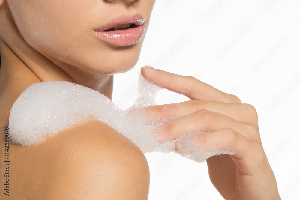 Young beautiful woman washing her shoulders with soap foam.