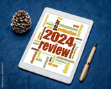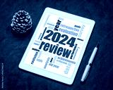 2024 year review word cloud on a digital tablet, end of year business analysis concept