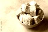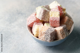 Colorful dessert cubes arranged in a bowl on a light surface ready for enjoyment