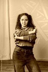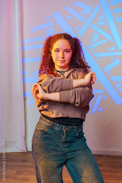 A young woman with curly red hair stands in a studio, posing with her arms crossed. She is wearing a light brown hoodie and blue jeans