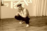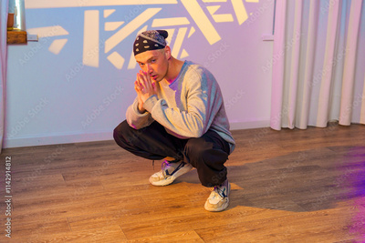 A young man wearing a grey sweatshirt and black pants sits in a squat position on a wooden floor