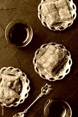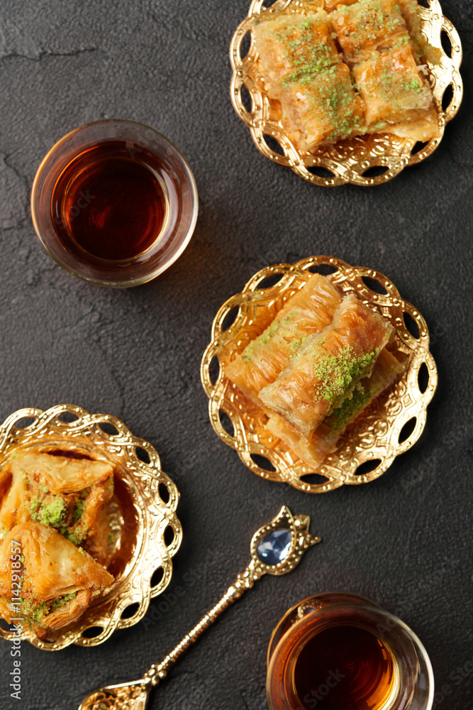 Delightful desserts featuring baklava served with traditional tea on ornate plates in an elegant setting