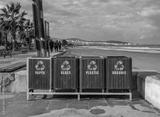Four trash cans are lined up on a beach, each with a different colored lid