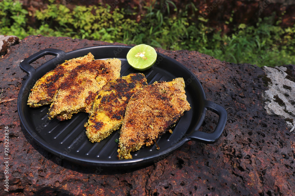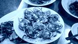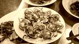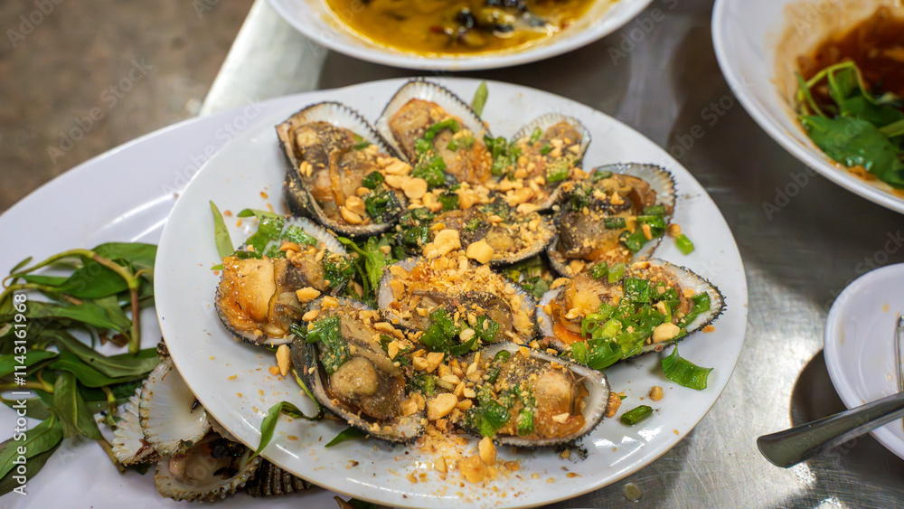Grilled half crenate ark or ark clam. Topped with oil scallion and grinded peanut. A Vietnamese street food. Eat with laksa leaves. Dip with sour and sweet fish sauce
